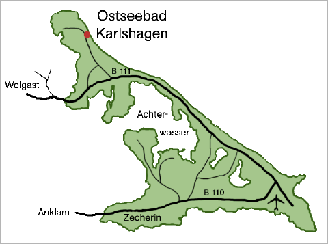 vom Norden kommend über die B 111 (Wolgast-Bannemin)